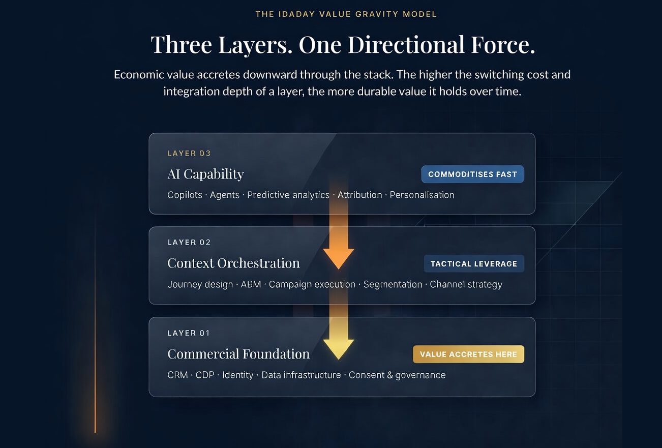 This is the core pattern behind Value Gravity™, a framework I use with enterprise clients. Enterprise attention - and certainly the conversation at Summit in two weeks - concentrates at the exciting top of the stack: generative AI, agentic workflows, next-generation personalisation. But risk does not accumulate where attention goes. It gravitates toward the ungoverned operational substrate underneath: vendor contracts, access policies, data classification in legacy ticketing systems signed off in 2019 and never revisited.