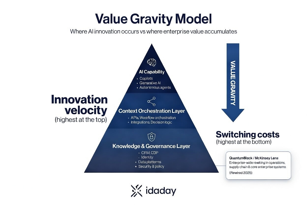 Value doesn't stay up there. It gravitates downward - pulled through context orchestration (APIs, workflow engines, integrations, decision logic) and into the wide, governed base: your CRM platforms, CDPs, identity systems, data warehouses, security policies.